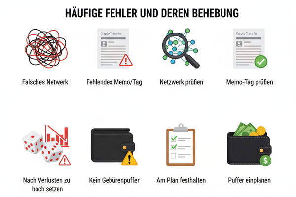 Trotz der hohen Sicherheit in einem Krypto Casino kann es immer wieder zu Fehlern kommen. Einer der häufigsten Fehler beruht auf der Auswahl eines falschen Netzwerks. Durch Krypto Einzahlungs Fehler kann es zu Verlusten kommen, wenn Geld an eine nicht unterstützte Blockchain gesendet wird. Ein weiterer Fehler liegt darin, dass Transaktionshashes und Screenshots nicht gespeichert werden. Auch die Nutzung hochvolatiler Währungen sollte vermieden werden. Stattdessen eignen sich Stablecoins oder eine Mischung aus Stablecoins und Altcoins. Prüfen Sie vor jeder Transaktion, ob ein gültiges Netzwerk gewählt wurde, und achten Sie auf die Währung, die Sie zum Spielen nutzen. So können Sie sich vor Fehlern und damit verbundenen Verlusten schützen.
