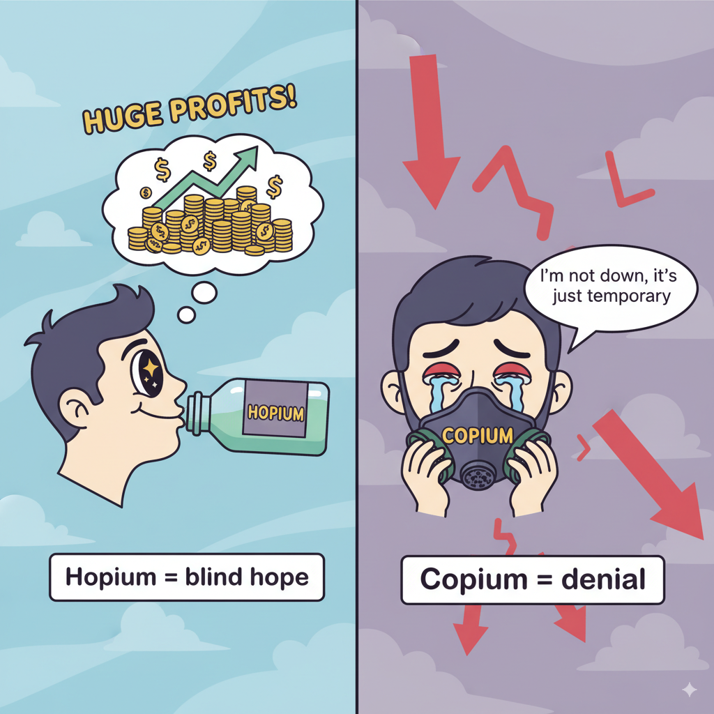Hopium is about future expectations. Copium is about dealing with past disappointments. Both distract from reality.