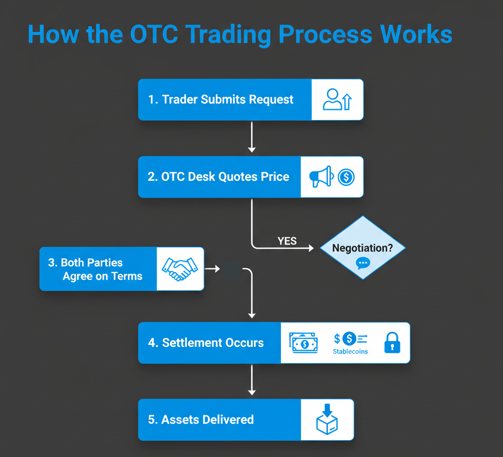 While every platform has its own approach, most OTC trades follow a structured workflow designed to minimize risk and ensure smooth settlement.