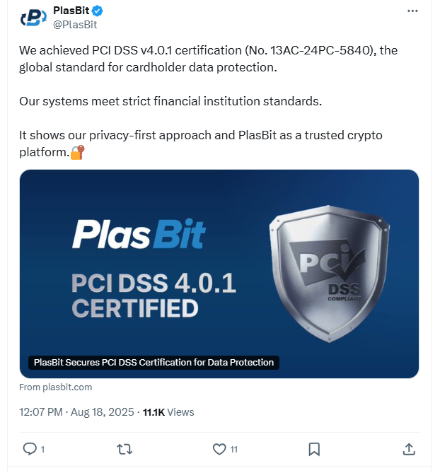 The PCI DSS v4.0.1 certification reflects PlasBit’s ongoing commitment to setting high standards of security and compliance in the crypto industry.