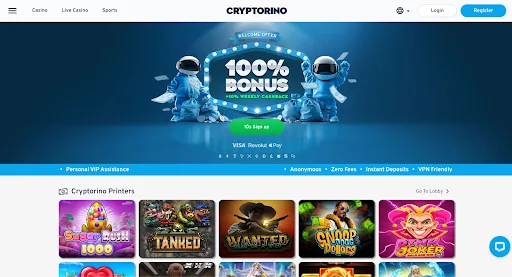 Casinopunkz markets itself as a retro, privacy-first casino with VPN-friendly access. Licensed in Anjouan, it requires just an email to sign up, with instant deposits and withdrawals across BTC, ETH, USDT, SOL, DOGE, BNB, and more. Its game selection is massive: 5,000+ titles from 55 providers, including 900+ live dealer tables. The welcome bonus is 100% up to €5,000, though its 80x wagering requirement is demanding. It lacks a sportsbook, but shines with slot tournaments, provably fair gaming, and retro-styled branding. For privacy-minded players who prioritize game depth, Casinopunkz is a strong option in 2025.