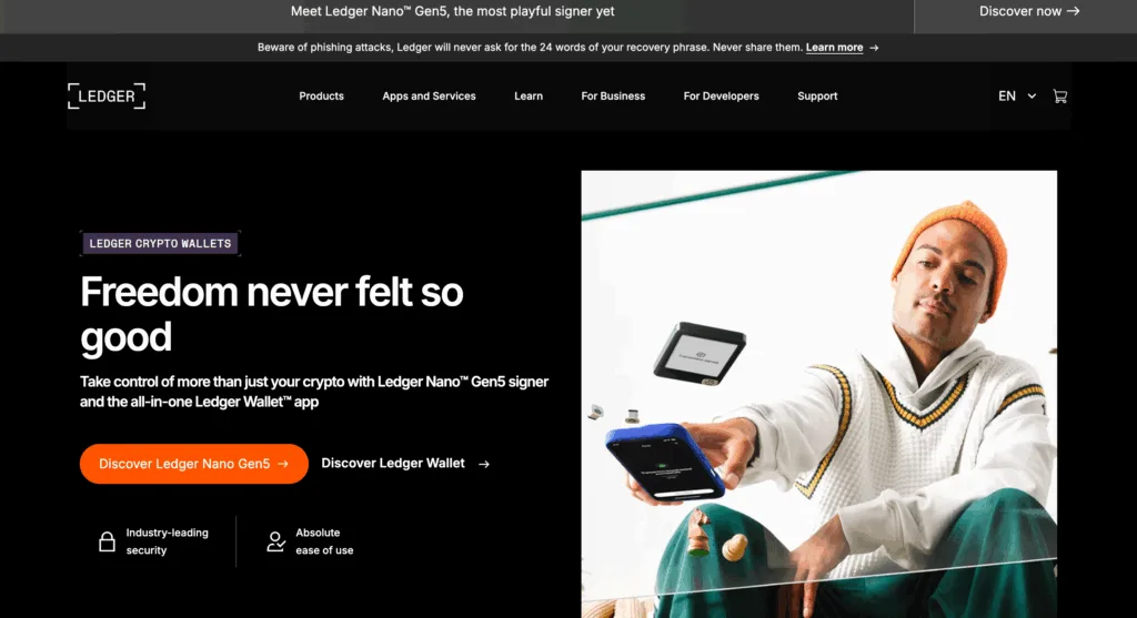Ledger is a world leader in hardware wallets. The Nano X and new Ledger Flex models store your private keys offline, safe from hackers or malware. The devices connect via Bluetooth or USB to the Ledger Live app, allowing secure management of assets.