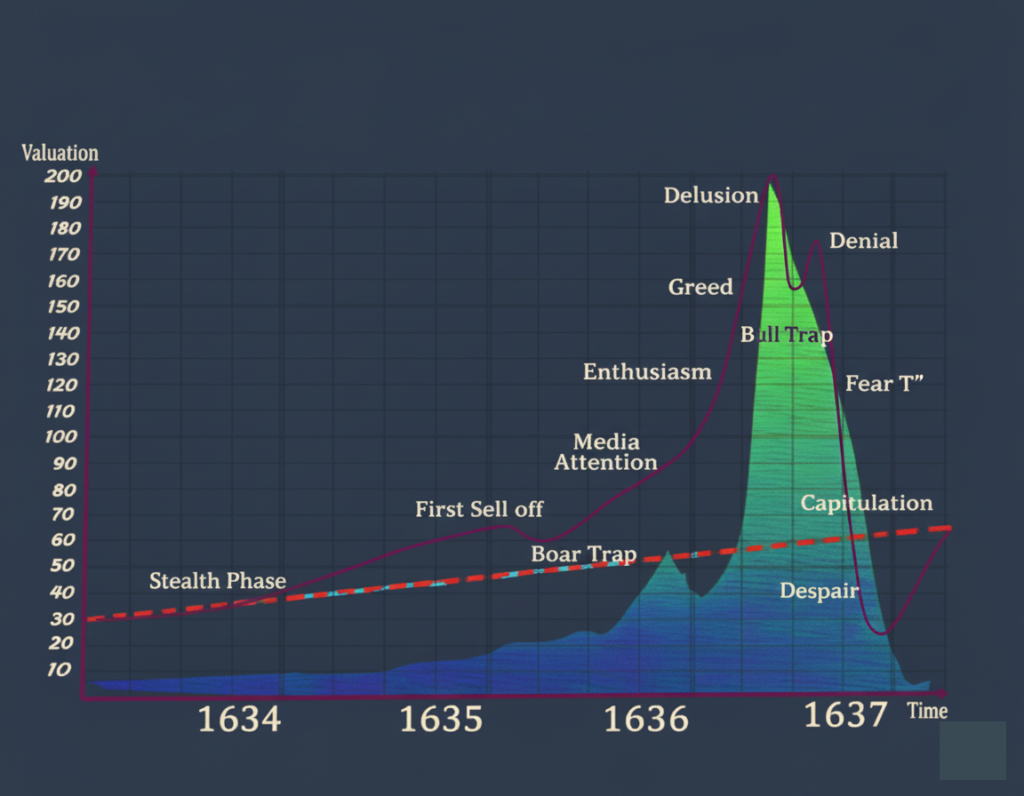 The Tulip Mania is often cited as the first speculative bubble in modern economic history. In the 1630s, during the Dutch Golden Age, the price of tulip bulbs surged to astronomical levels. At its peak, a single tulip bulb could be sold for the price of an Amsterdam townhouse. The rise in tulip prices was driven by speculation, as people believed the prices would continue to rise.