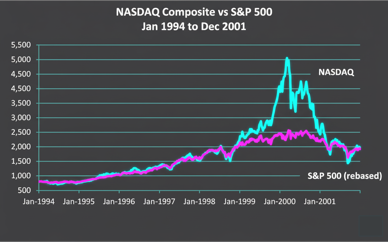 At the peak of the bubble, the NASDAQ stock exchange had risen by over 400% in just a few years, with many dot-com companies being valued in the billions despite having no clear path to profitability. The media hype around the internet and the rapid growth of technology companies contributed to the overvaluation. However, as reality set in and many dot-com companies failed to deliver on their promises, the bubble burst, and the NASDAQ lost nearly 80% of its value by 2002.