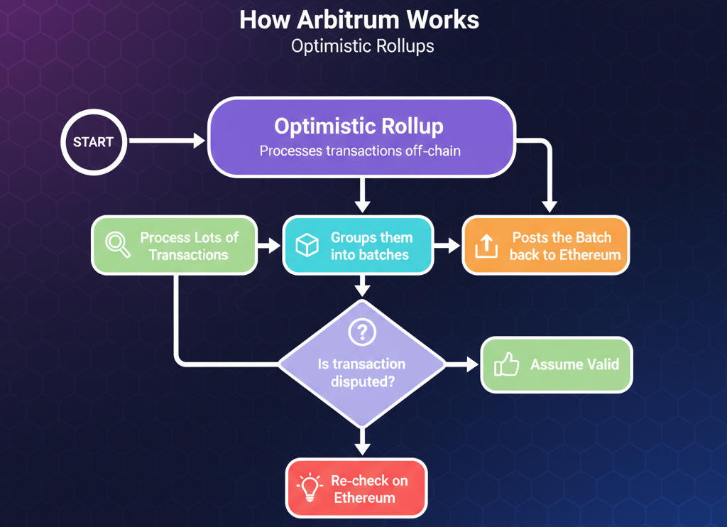 Arbitrum is a Layer-2 network built on top of Ethereum that helps it run faster, cheaper, and at a much larger scale without replacing Ethereum or changing how it works. Instead of forcing every transaction to run directly on the Ethereum main chain, Arbitrum processes most of the work off-chain, bundles the results together, and then sends a compressed summary back to Ethereum for final verification.