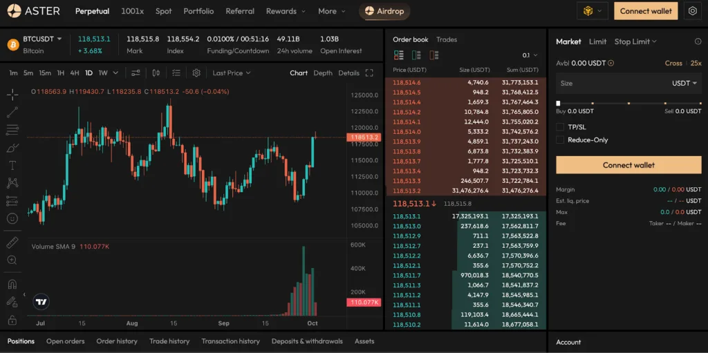 Aster is a next-generation decentralized exchange designed for trading perpetual futures and spot assets without intermediaries. It runs on top of several blockchains, including BNB Chain, Ethereum, Solana, and Arbitrum. The platform allows users to place trades directly from their own crypto wallets while retaining full custody of their assets.
