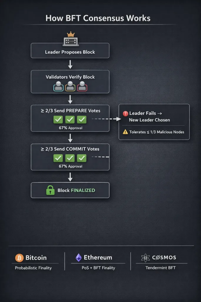 Without BFT-style guarantees, blockchains would be vulnerable to double-spends, chain rewrites, and coordinated attacks. Every confirmed transaction you see on-chain exists because a majority of validators reached agreement despite potential adversaries.