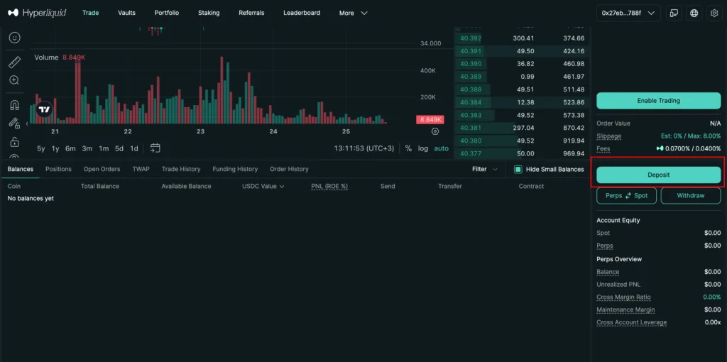 • Bridge USDC (for perps margin) or HYPE (for gas/staking) to Hyperliquid. You can later transfer HYPE between HyperCore and HyperEVM if you plan to use smart contracts or build on-chain strategies.