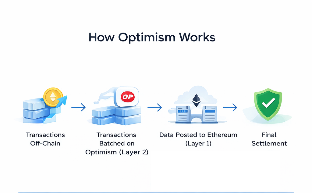 As Ethereum’s network traffic increases, so do its gas fees and congestion. Optimism solves this by executing transactions off-chain while posting compressed data back to the Ethereum mainnet. It uses a mechanism known as “optimistic rollups”, which assumes transactions are valid unless proven otherwise. This approach delivers faster speeds, lower costs, and a smoother experience for users and developers alike.