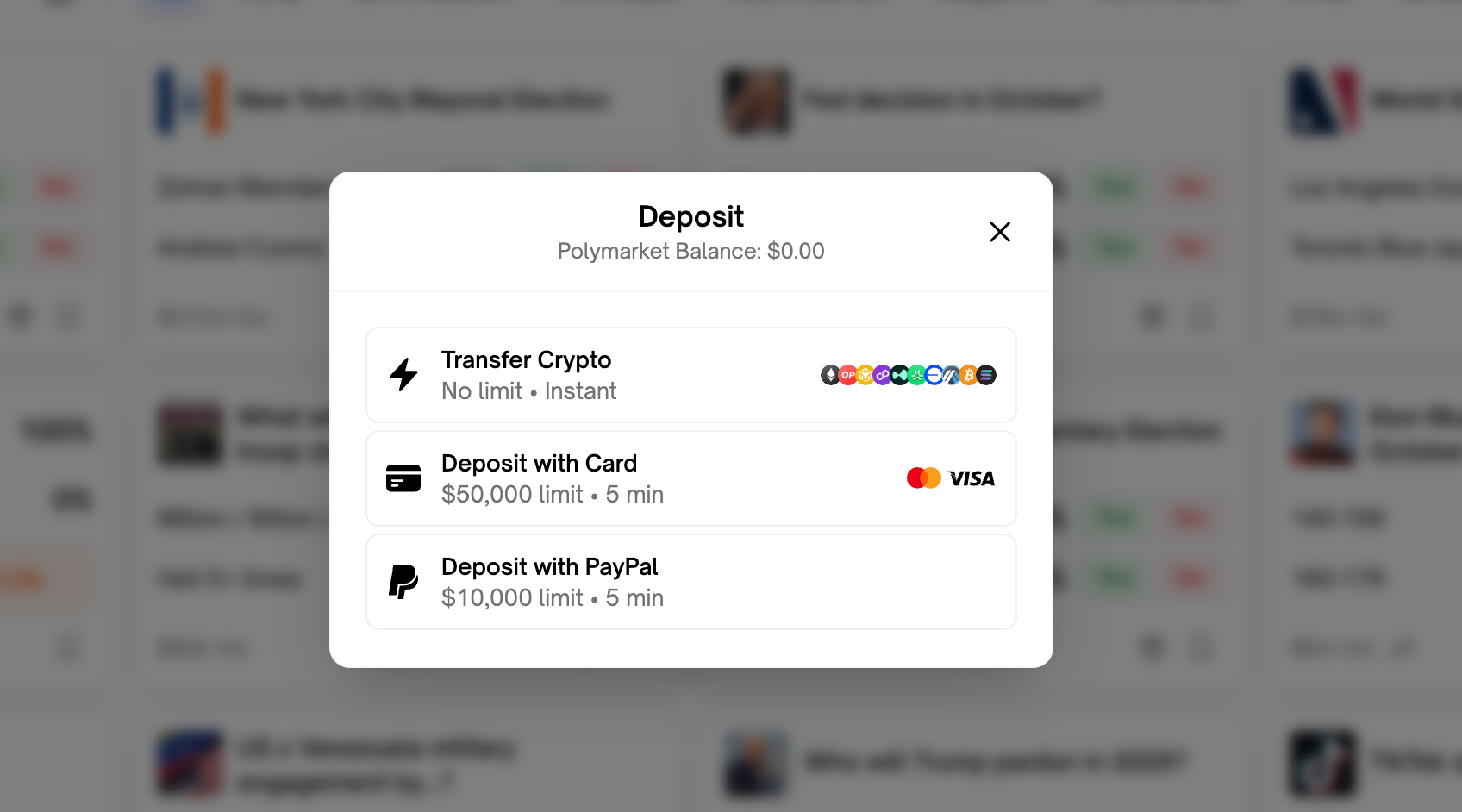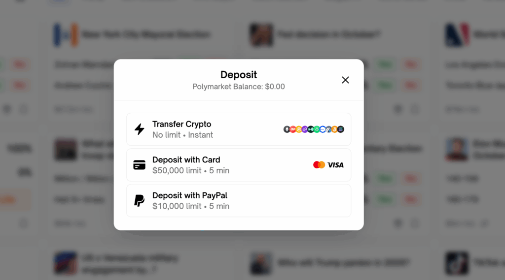 • Transfer Crypto: Deposit instantly using multiple supported cryptocurrencies and networks (like Polygon, Ethereum, Optimism, and Arbitrum).