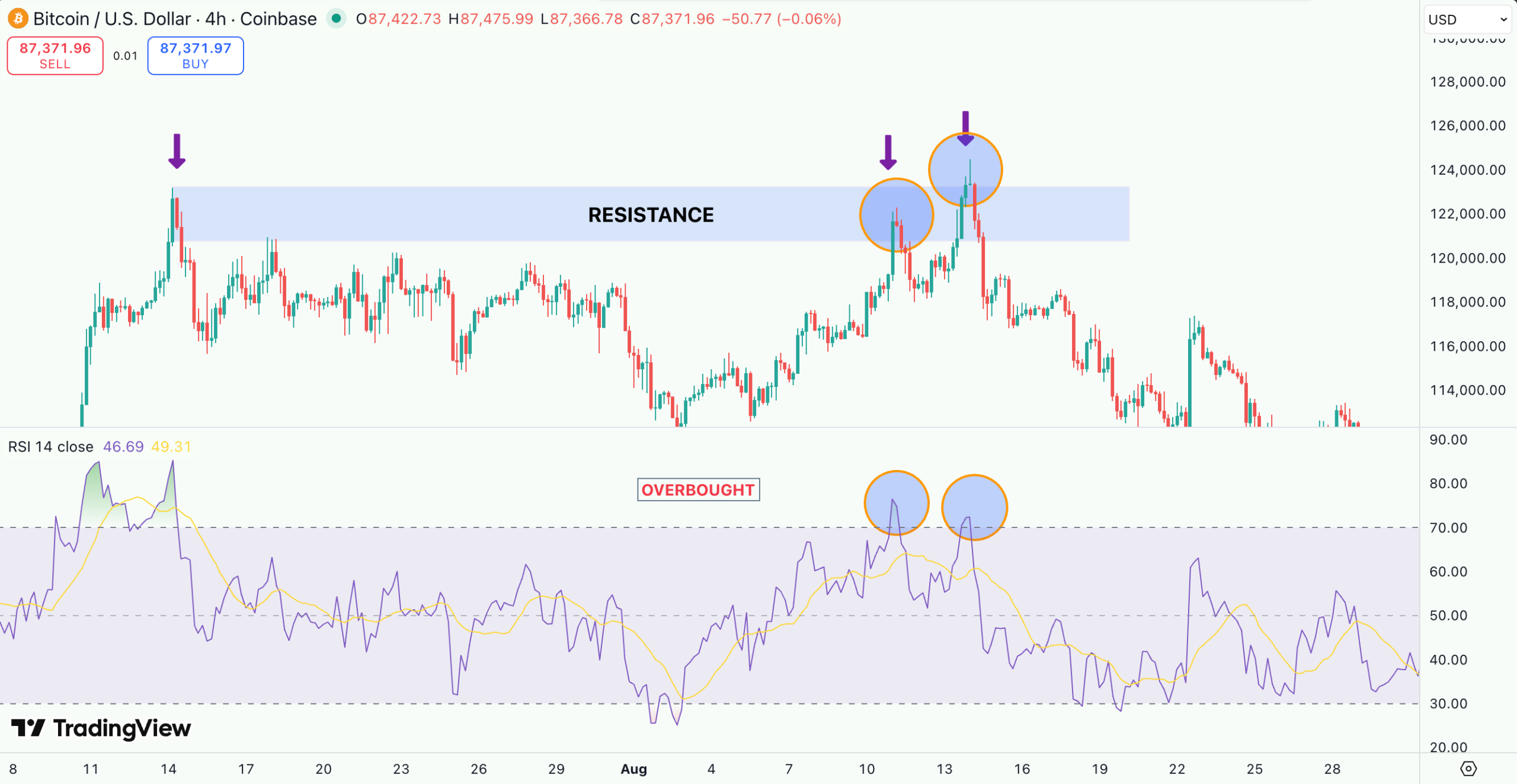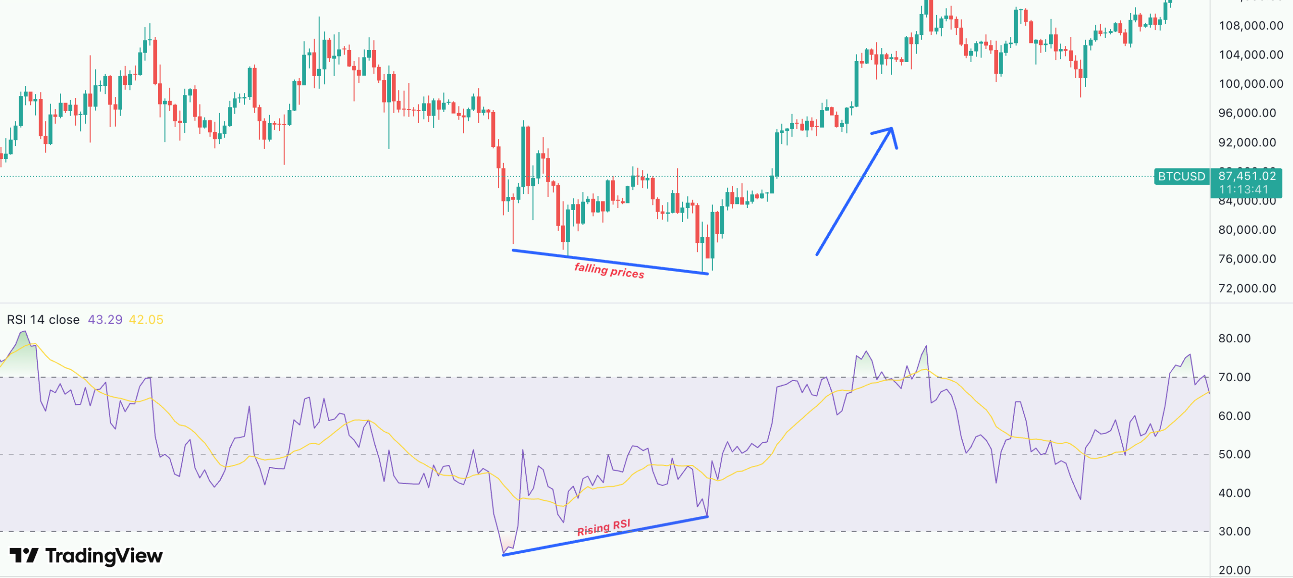 RSI can remain overbought or oversold much longer than expected, especially in crypto or fast‑moving stocks. That’s why context always matters.