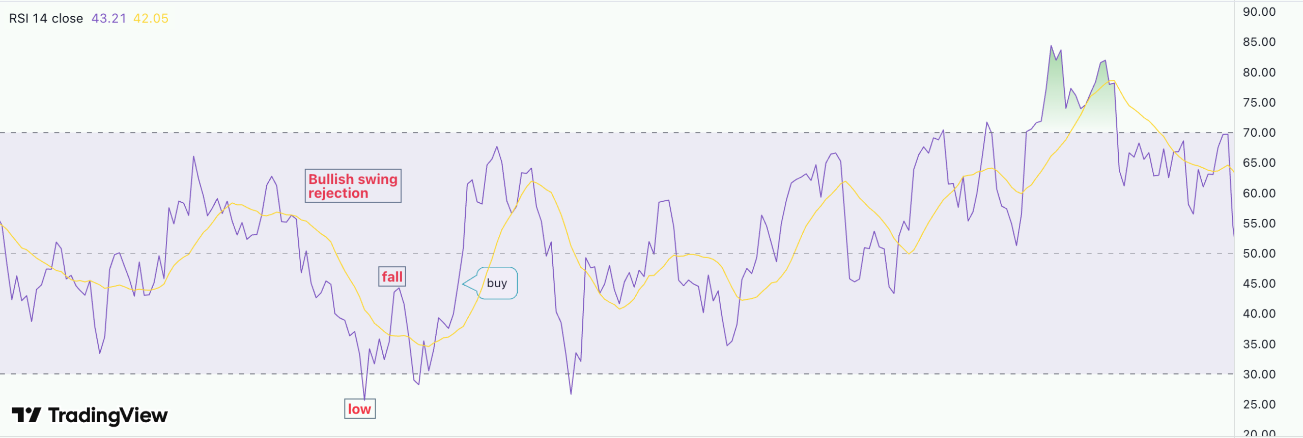 Swing rejections focus on RSI behavior after leaving an extreme zone.